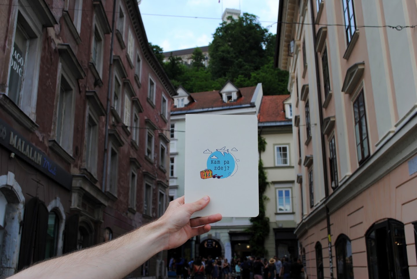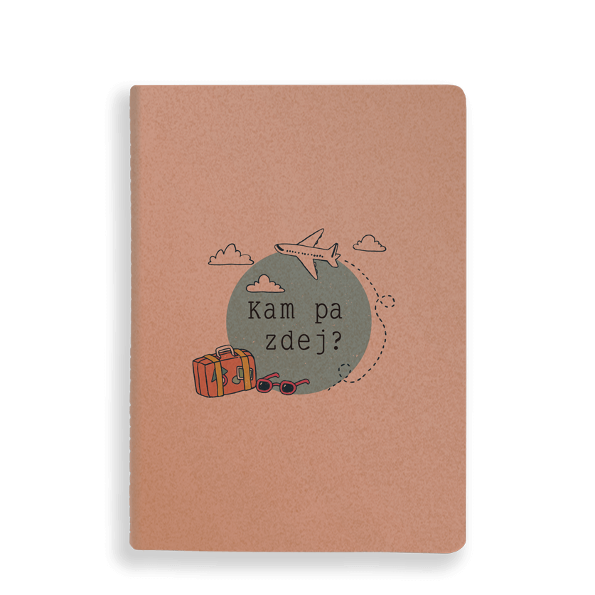 Mandljevo roza zvezek z napisom "Kam pa zdej?" in ilustracijo potujočega letala