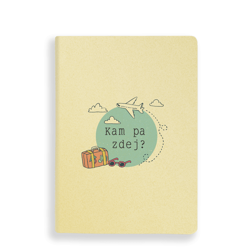 Citrusno rumen zvezek z napisom "Kam pa zdej?" in ilustracijo potujočega letala