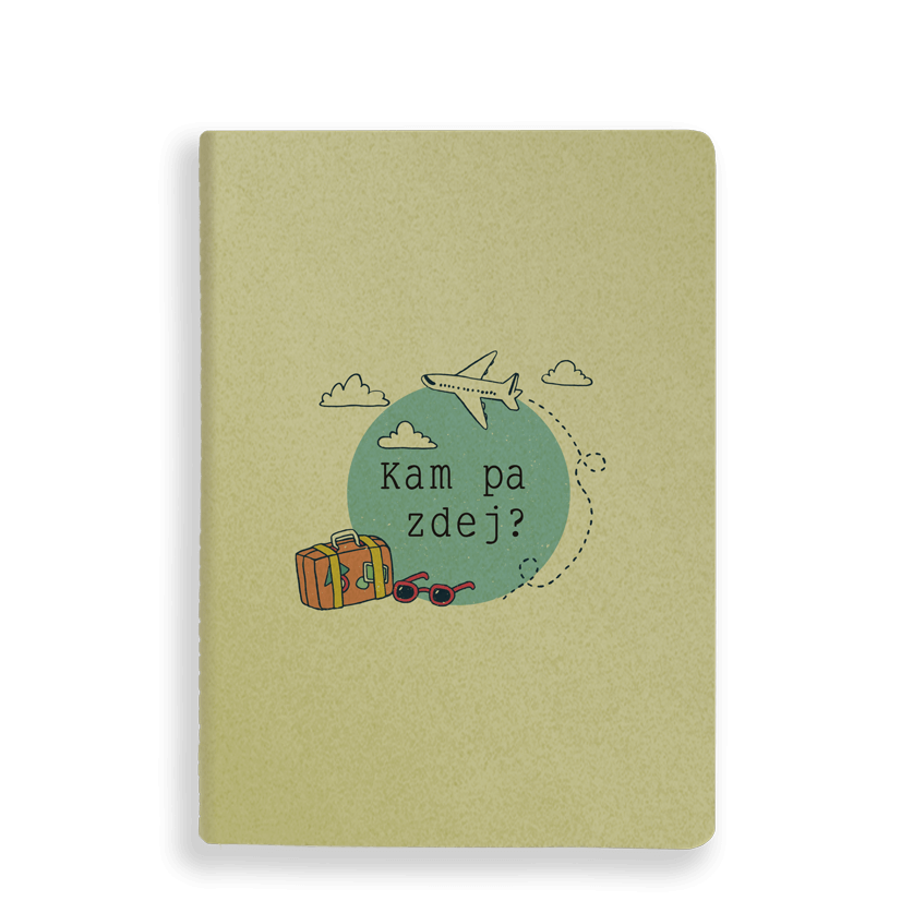 Olivno zelen zvezek z napisom "Kam pa zdej?" in ilustracijo potujočega letala