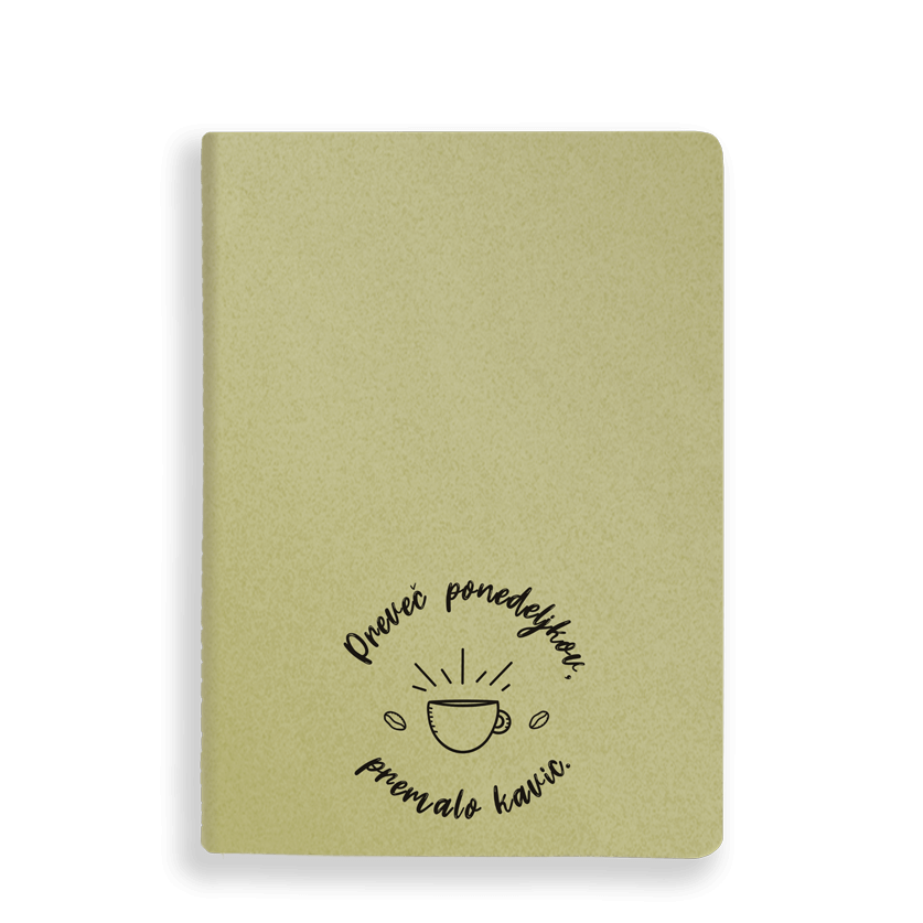 Olivno zelen zvezek z napisom "Preveč ponedeljkov, premalo kavic." in ilustracijo kave