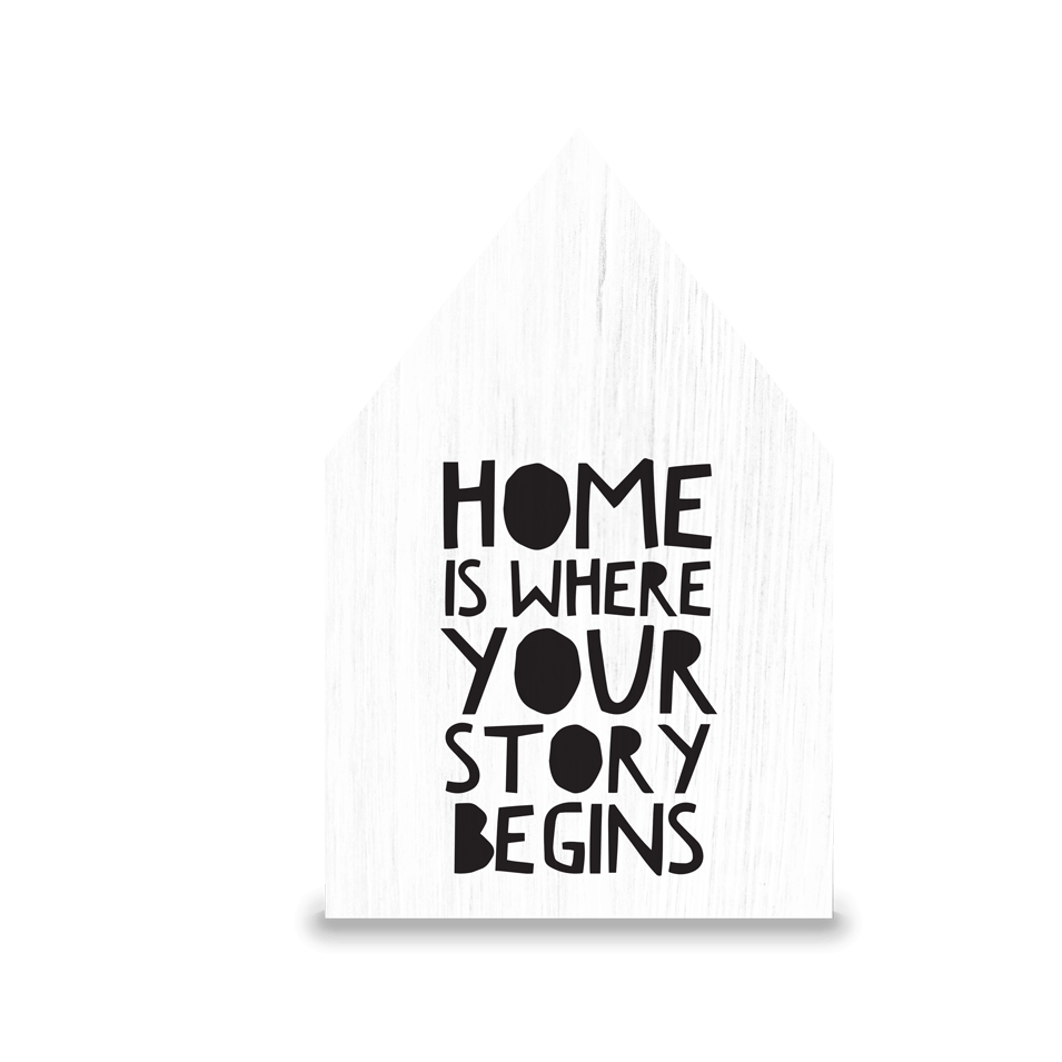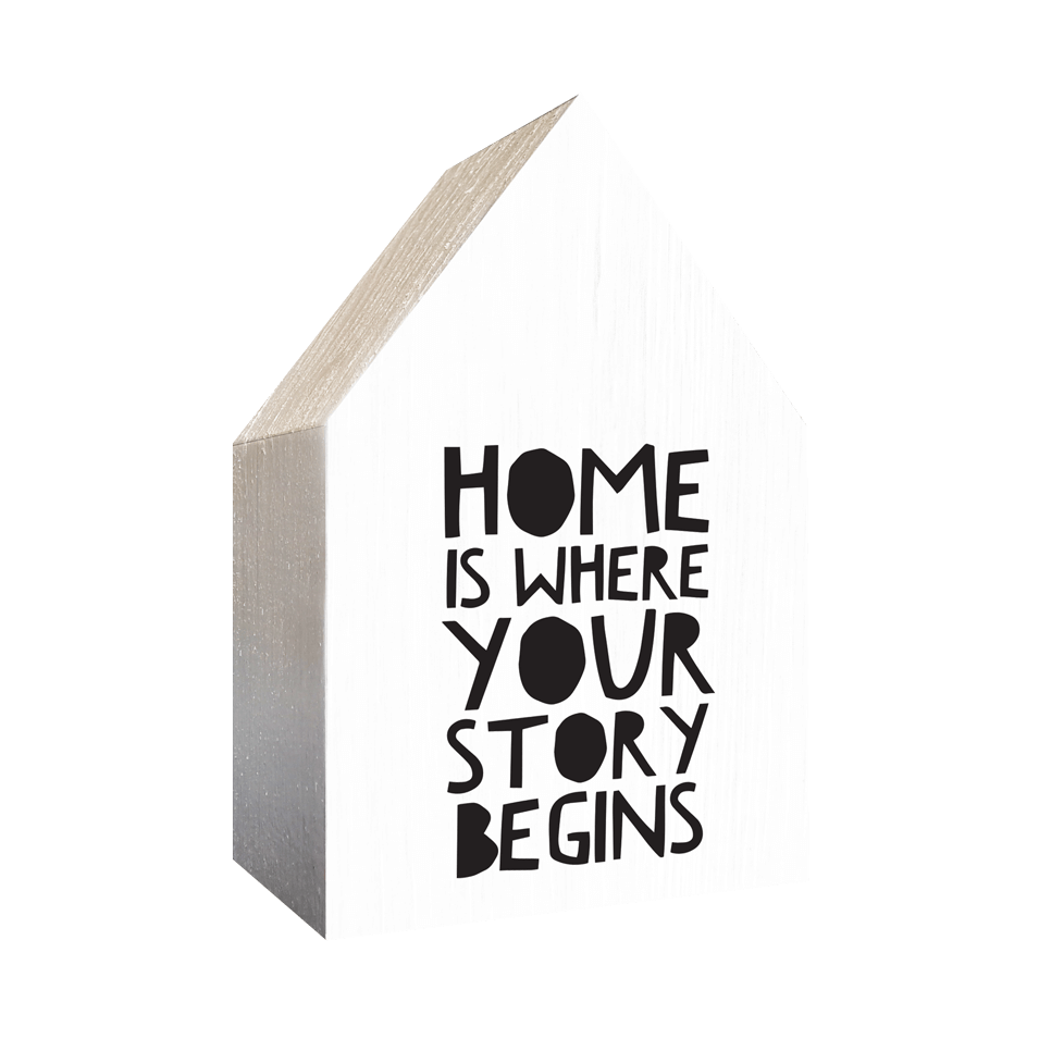 Lesena hiška z napisom "Home is where your story begins"