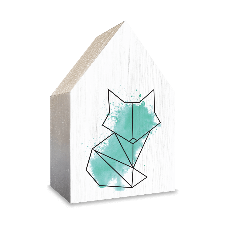 Lesena hiška z ilustracijo foxboutique lisičke poškropljene z mint zeleno barvo