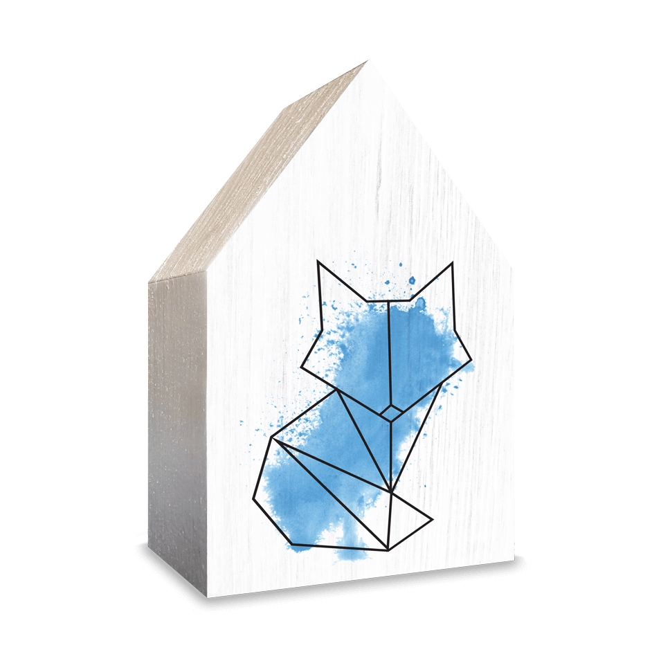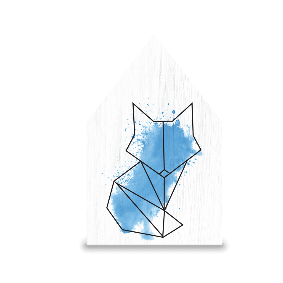 Lesena hiška z ilustracijo foxboutique lisičke poškropljene z modro barvo