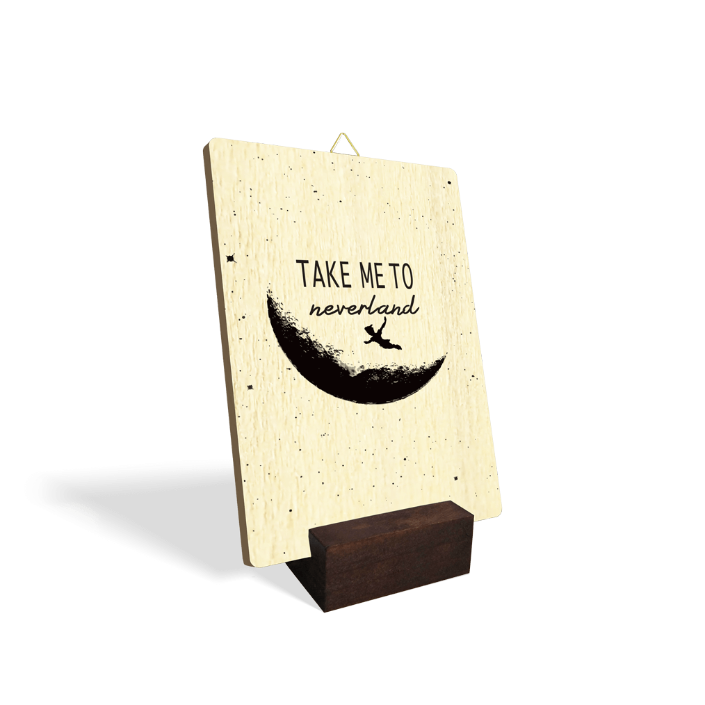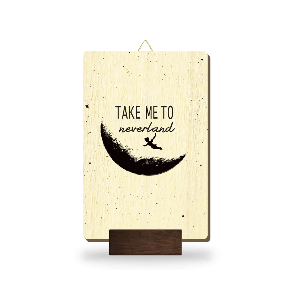 Lesena slika z napisom "Take me to neverland" in ilustracijo Petra Pana, ki leti mimo Lune