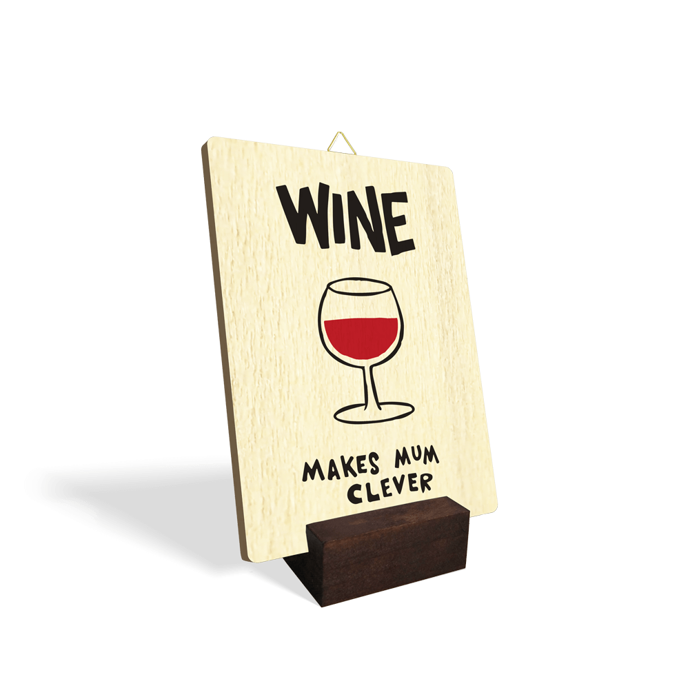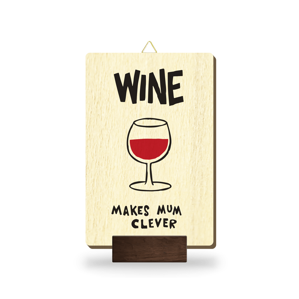 Lesena slika z napisom "Wine makes mum clever" in ilustracijo kozarca vina