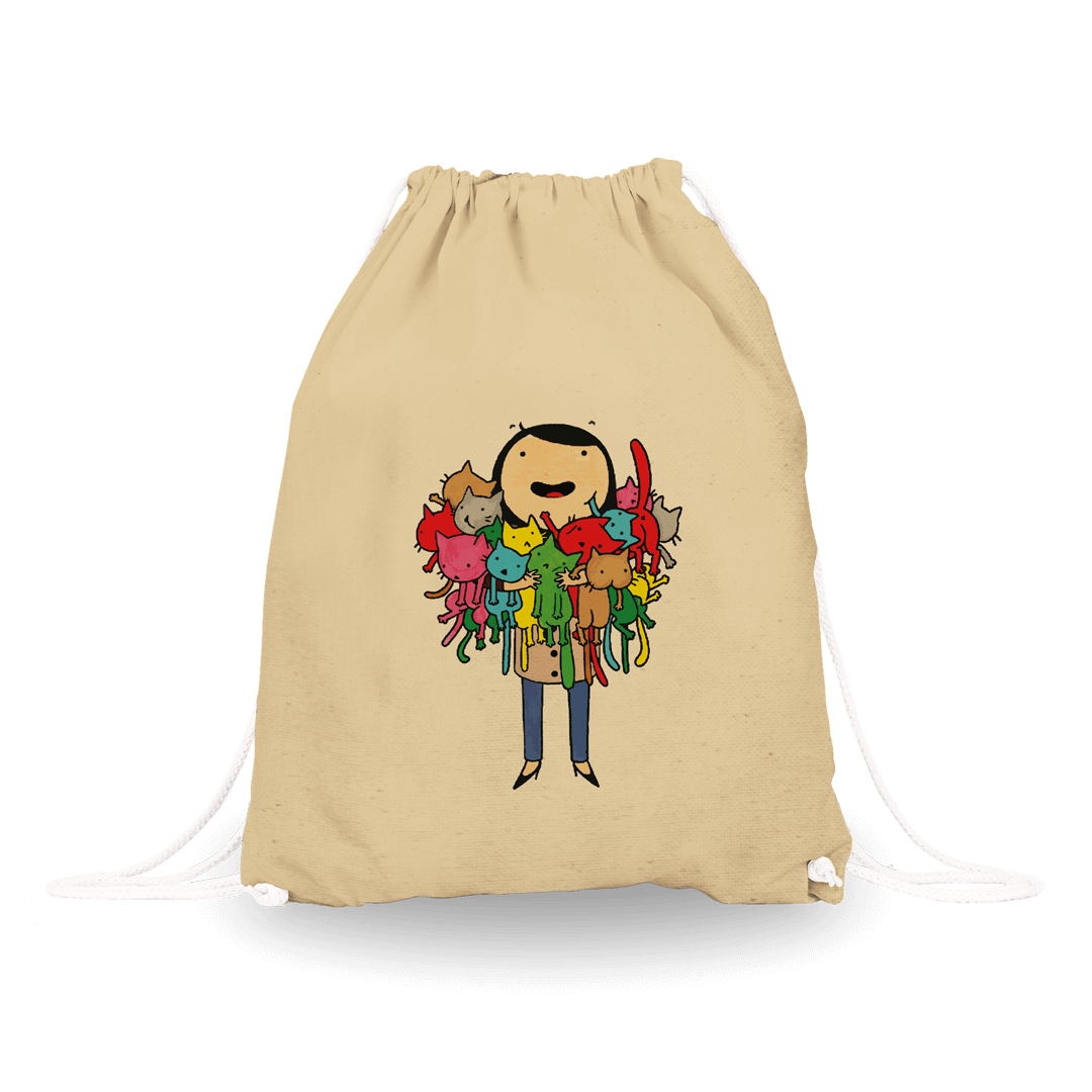Bombažni nahrbtnik z ilustracijo ženske, ki objema 15 mačk
