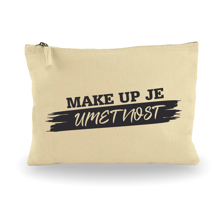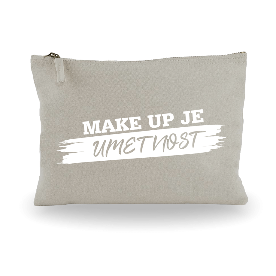 Bež bombažna toaletna torbica z napisom "make up je umetnost"