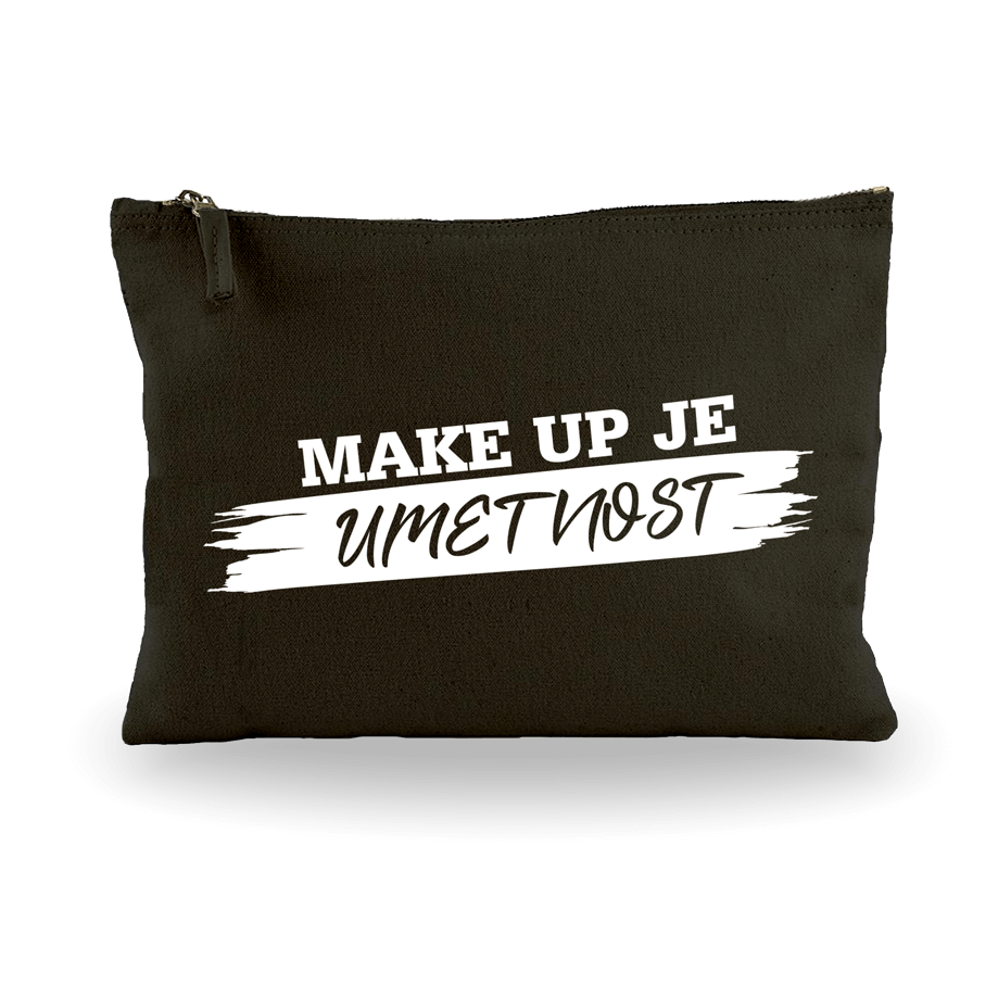 Črna bombažna toaletna torbica z napisom "make up je umetnost"
