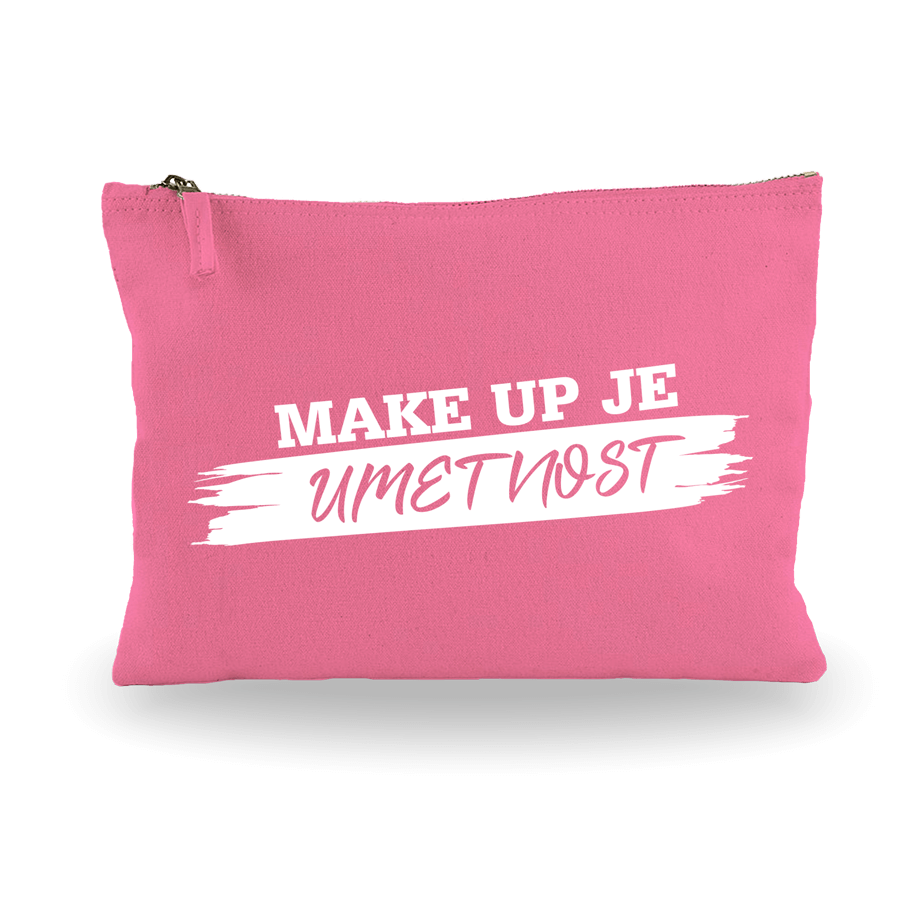 Roza bombažna toaletna torbica z napisom "make up je umetnost"